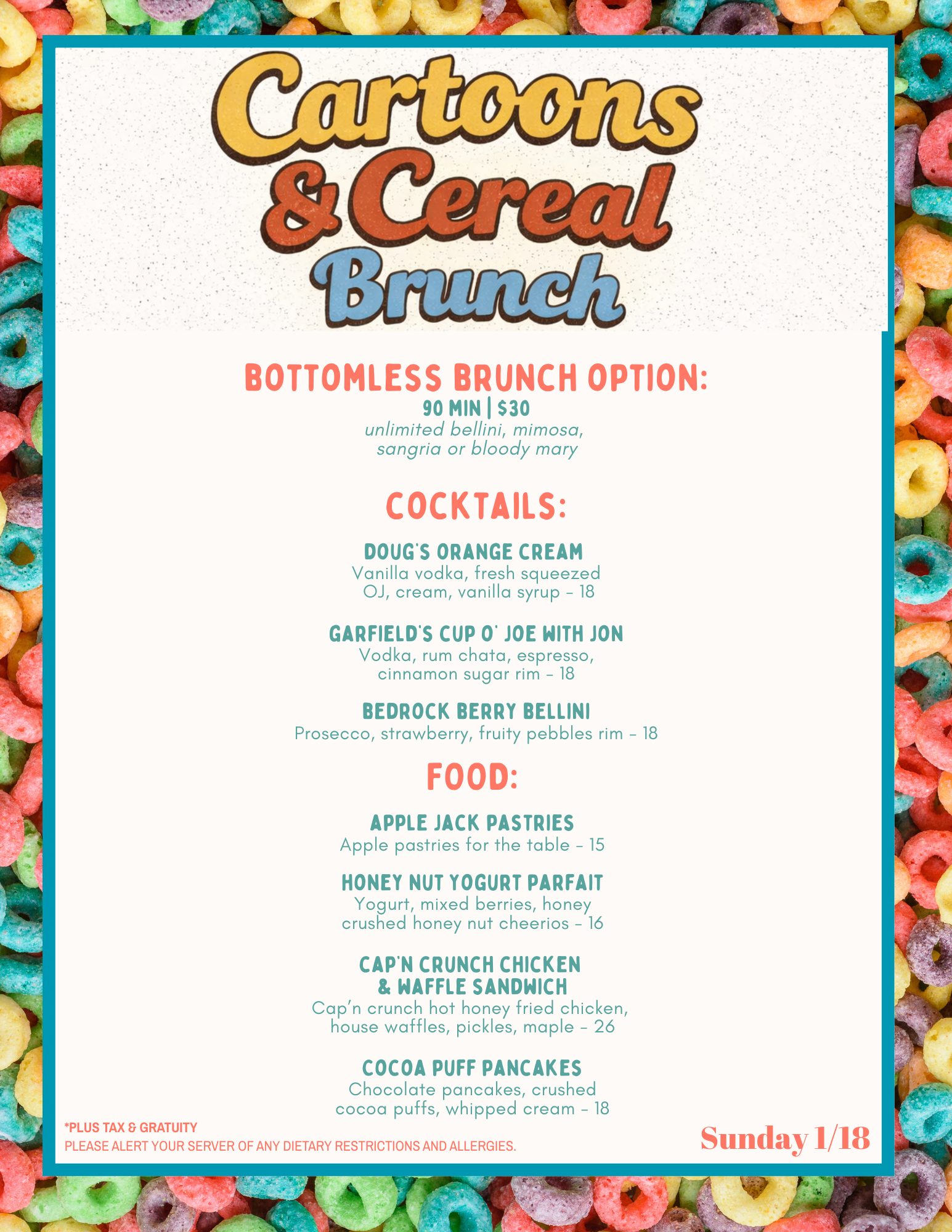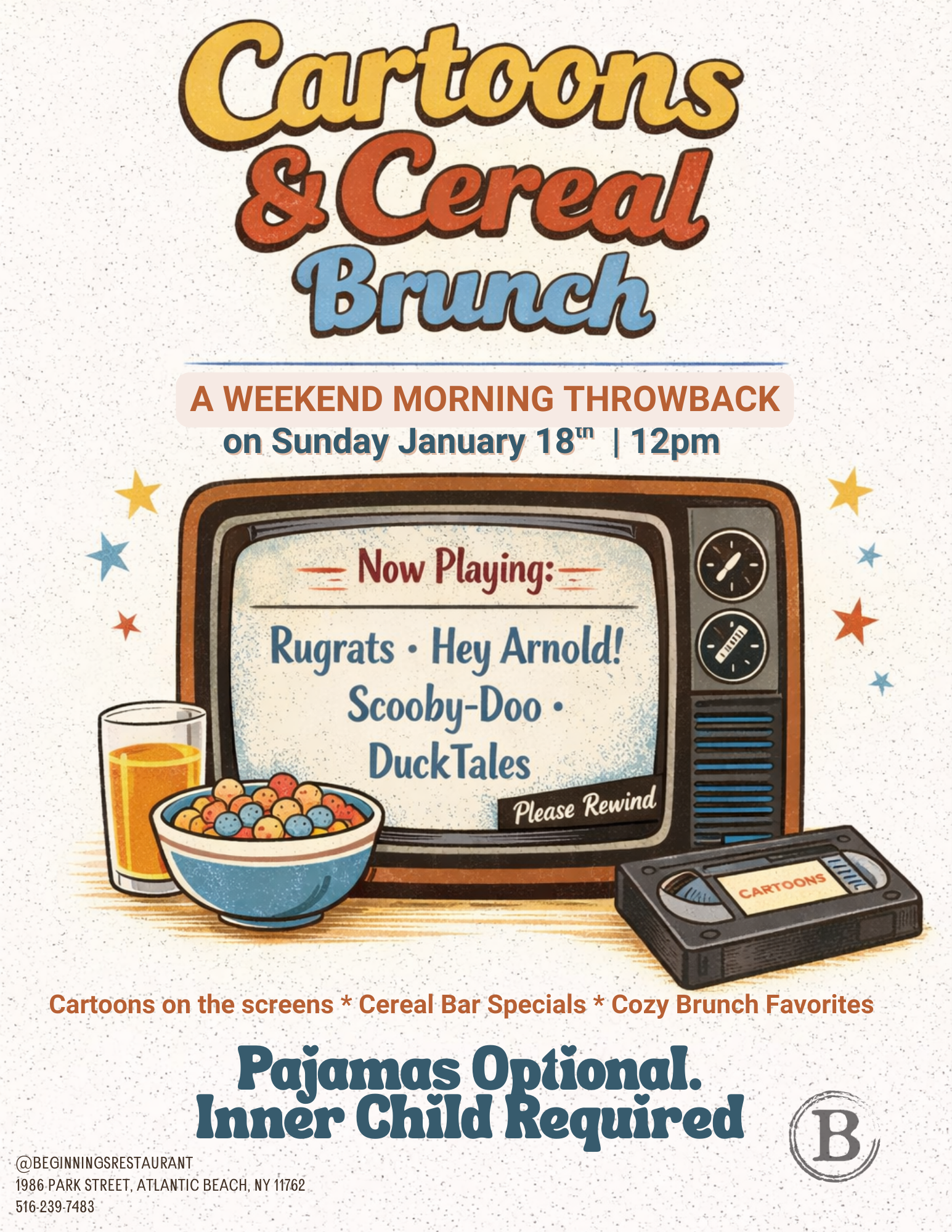 Relive your favorite Saturday mornings — but make it brunch. Join us for Cartoons & Cereal Brunch featuring classic throwbacks like Rugrats, Hey Arnold!, Scooby-Doo, and DuckTales playing on the screens, cozy brunch favorites, and fun cereal-inspired specials.