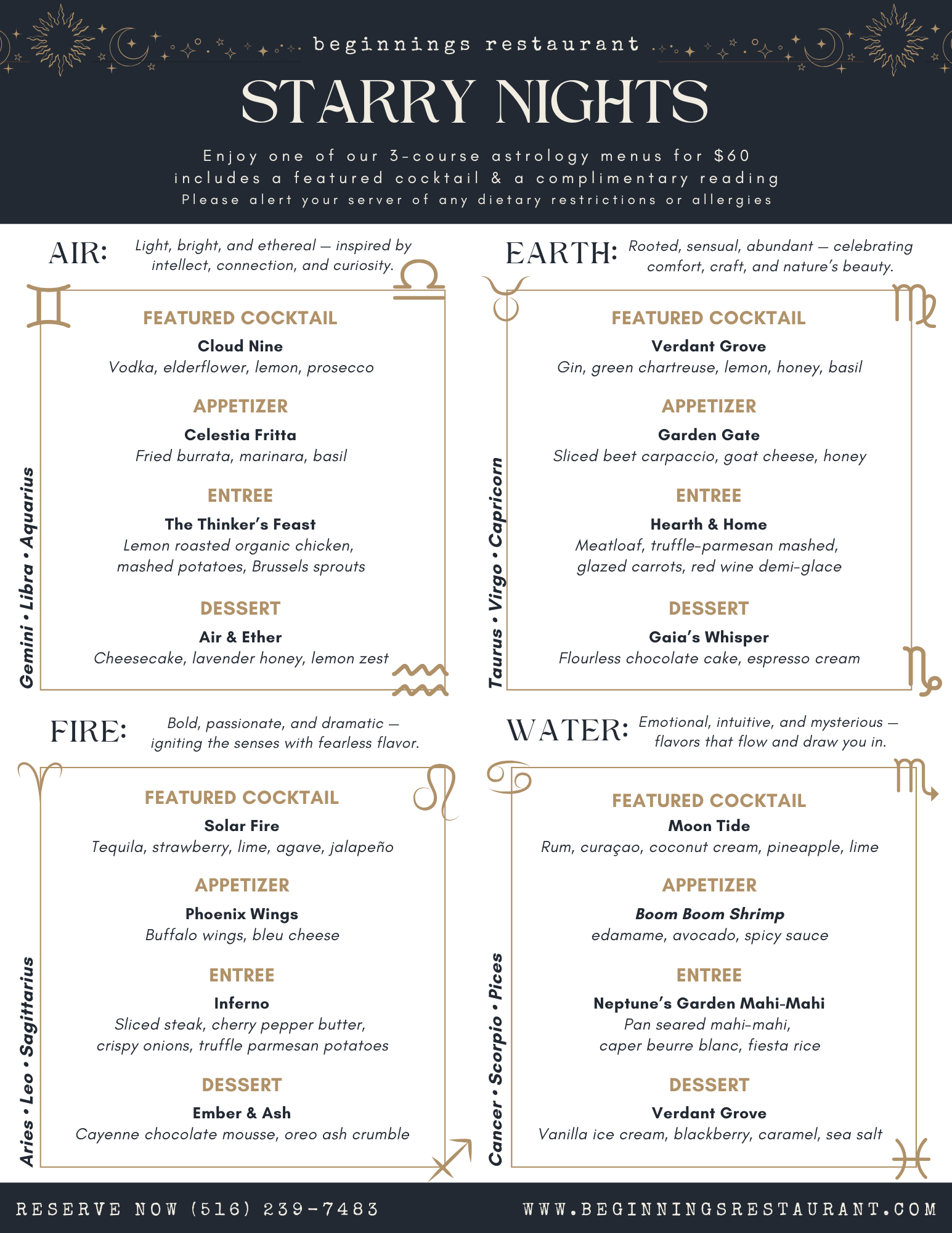 Enjoy a celestial dining experience featuring a 3-course set menu, cosmic cocktail, and a complimentary personal reading — or let the stars decide and draw a card to reveal the dishes destined for you: $60 per guest.